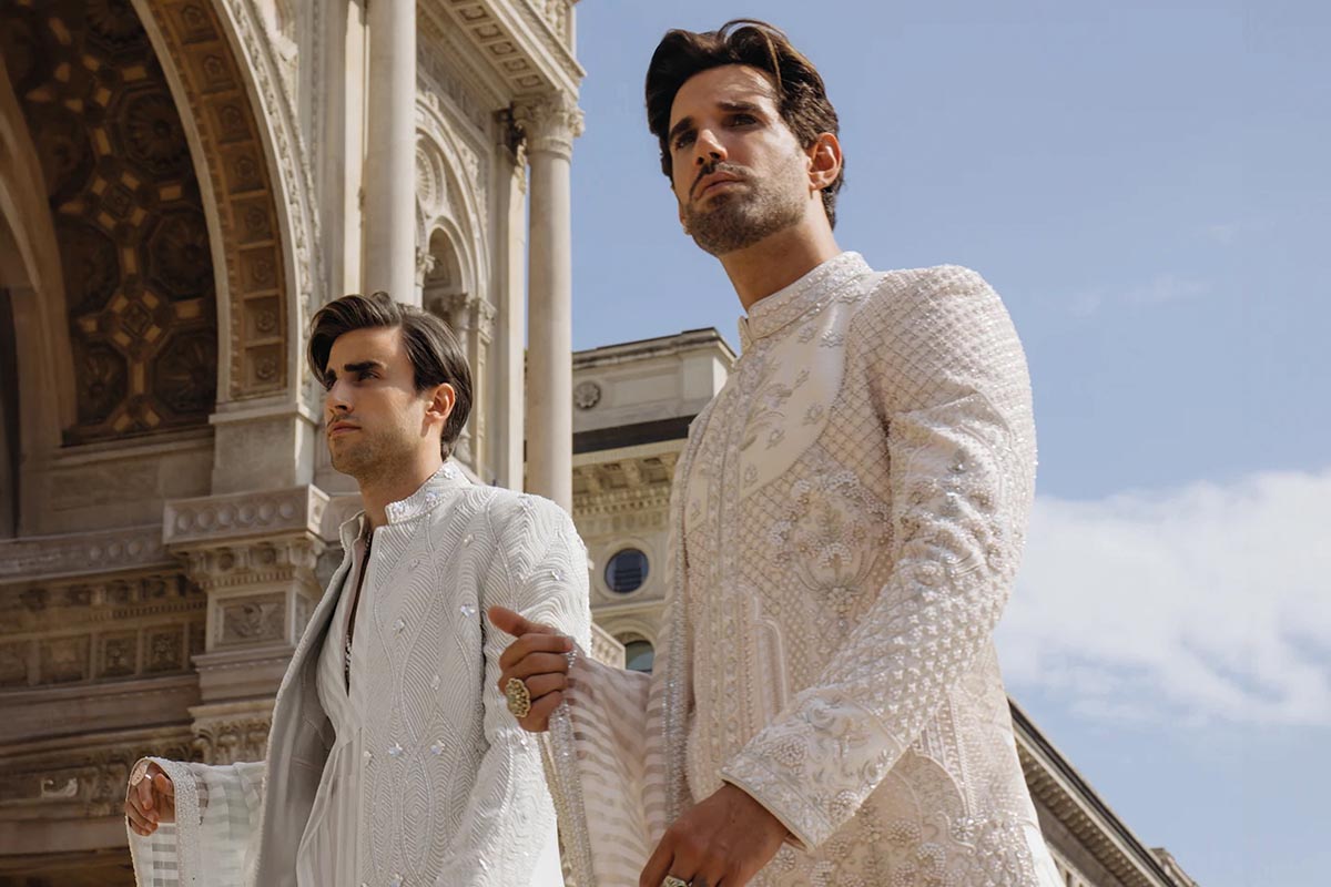 Every piece at Kora tells a tale woven in silk, jacquard, or velvet. The brand takes the timeless codes of Indian wedding attire – hand-embroidered sherwanis, regal bandhgalas, tailored kurta sets – and reinterprets them for today’s global groom. With clean lines, balanced embroidery, and modern hues like sage, ivory, and champagne gold, Kora designs speak a language of quiet luxury.