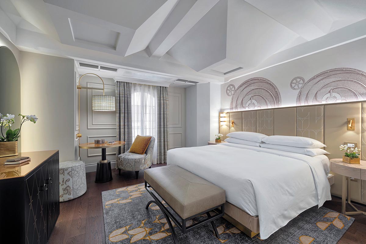 Interiors nod to local heritage with Murano glass, lagoon-inspired tones and subtle references to the building’s industrial past. Rooms balance style and comfort, offering plush beds and spacious marble bathrooms.