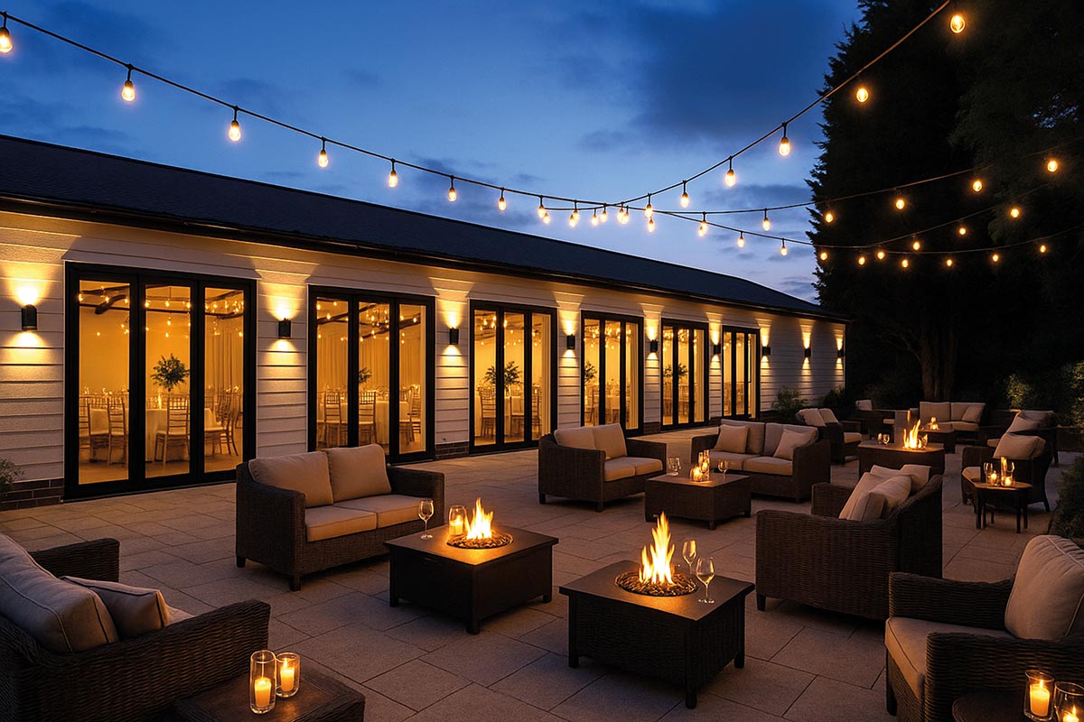 The Pavilion opens out onto the Cocktail Terrace, a space that feels made for golden hours and long summer nights. As the sun sinks over the deer park, festoon lights flicker on, wrapping the terrace in a warm, celebratory glow. Guests spill outside with cocktails in hand, the air humming with laughter and the soft crackle of conversation.
